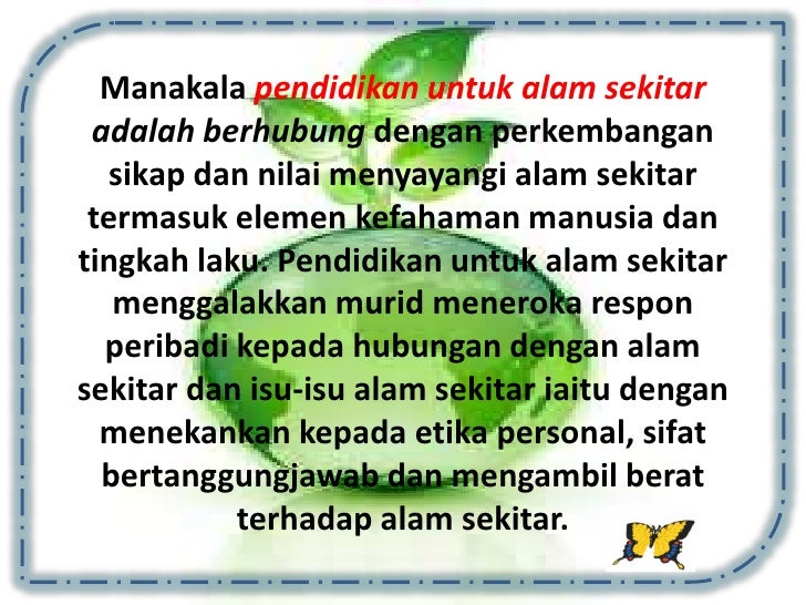 - 11. Manakala pendidikan untuk alam sekitar adalah berhubung dengan perkembangan sikap dan nilai menyayangi alam sekitar termasuk elemen kefahaman manusia dantingkah laku. Pendidikan untuk alam sekitar menggalakkan murid meneroka respon peribadi kepada hubungan dengan alamsekitar dan isu-isu alam sekitar iaitu dengan menekankan kepada etika personal, sifat bertanggungjawab dan mengambil berat terhadap alam sekitar.