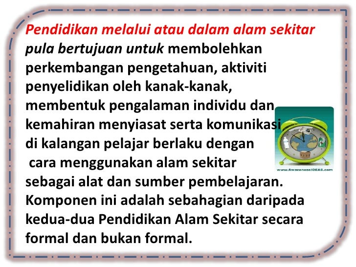- 12. Pendidikan melalui atau dalam alam sekitarpula bertujuan untuk membolehkanperkembangan pengetahuan, aktivitipenyelidikan oleh kanak-kanak,membentuk pengalaman individu dankemahiran menyiasat serta komunikasidi kalangan pelajar berlaku dengan cara menggunakan alam sekitarsebagai alat dan sumber pembelajaran.Komponen ini adalah sebahagian daripadakedua-dua Pendidikan Alam Sekitar secaraformal dan bukan formal.