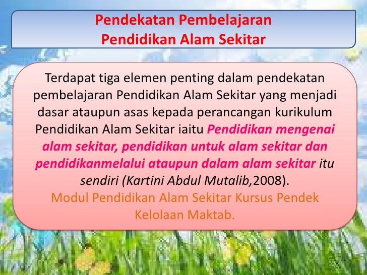 - 7. Pendekatan Pembelajaran Pendidikan Alam Sekitar Terdapat tiga elemen penting dalam pendekatanpembelajaran Pendidikan Alam Sekitar yang menjadi dasar ataupun asas kepada perancangan kurikulumPendidikan Alam Sekitar iaitu Pendidikan mengenai alam sekitar, pendidikan untuk alam sekitar danpendidikanmelalui ataupun dalam alam sekitar itu sendiri (Kartini Abdul Mutalib,2008). Modul Pendidikan Alam Sekitar Kursus Pendek Kelolaan Maktab.
